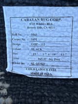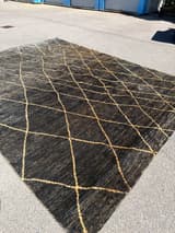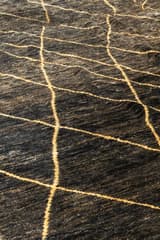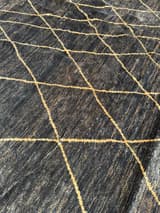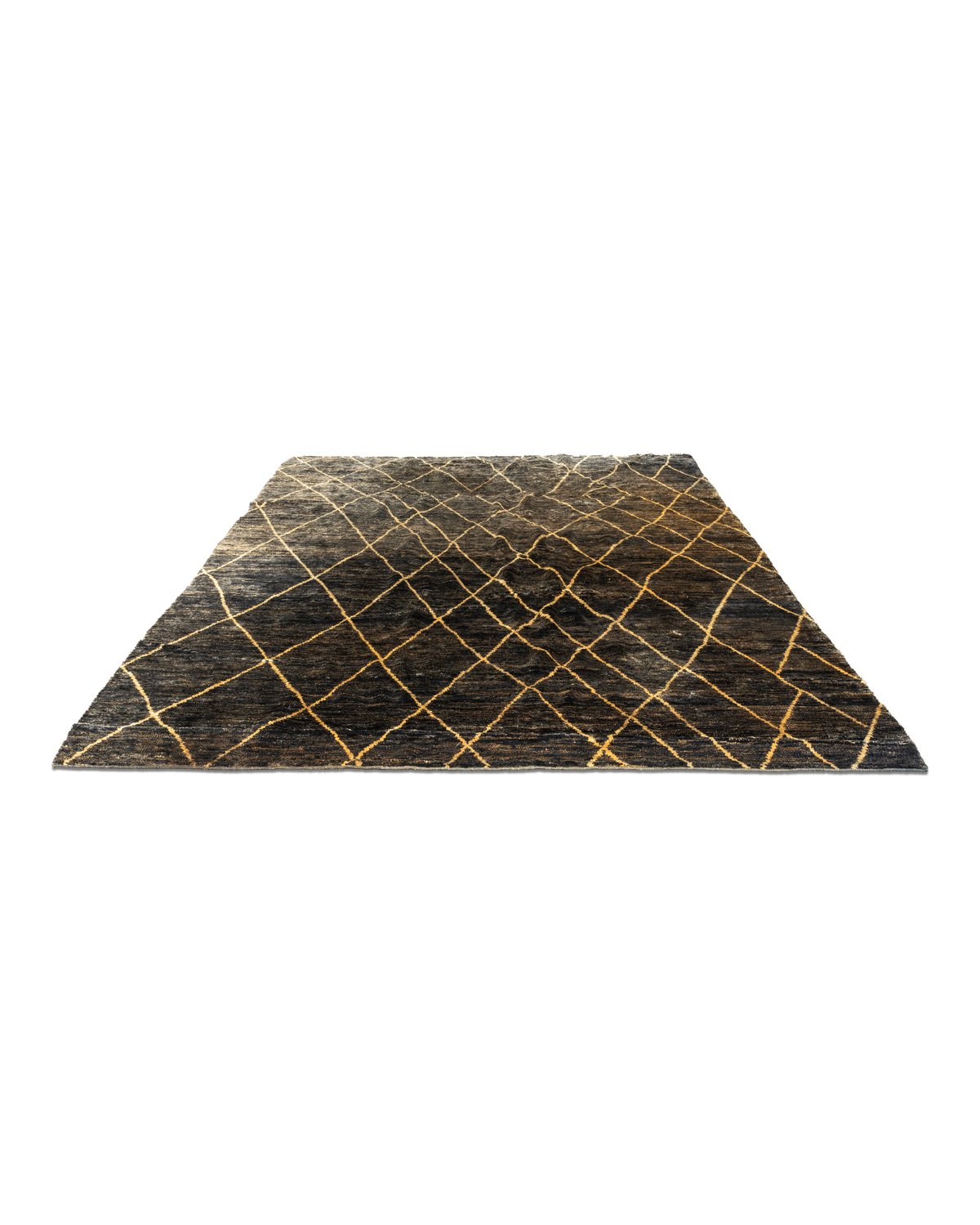 Hand-knotted wool rug with a black field and a diamond trellis pattern in gold. The pile is thick and textured, consistent with traditional Moroccan Berber designs. The maker's label for Caravan Rug Corp. of Beverly Hills is present on the reverse.
