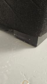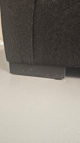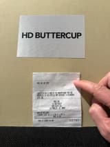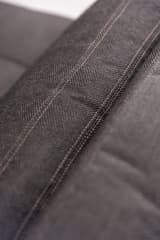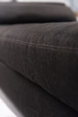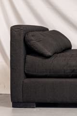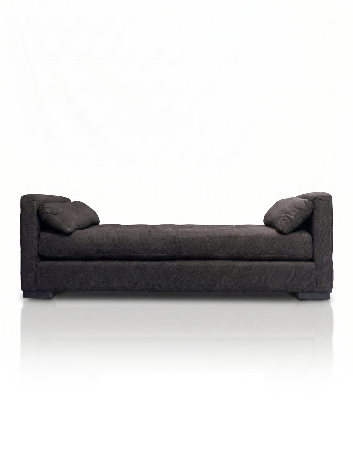 Deep button-tufted seat cushion on a low block frame, with two loose bolster cushions. Upholstered in a heavy charcoal herringbone-weave fabric with contrast topstitching. The HD Buttercup maker's label is present to the underside.