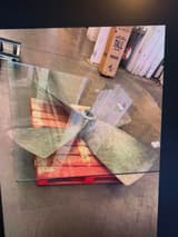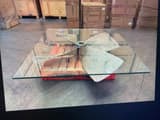 Coffee table with a reclaimed four-blade aeroplane propeller base in distressed steel. A square sheet of plate glass with polished edges forms the top. The central hub of the propeller supports the glass.