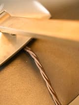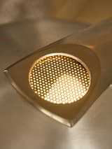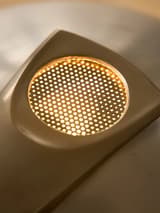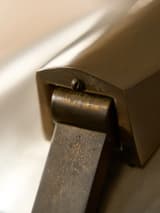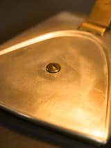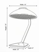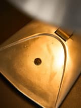 A mid-century modern desk lamp featuring a brushed brass-toned finish and a distinctive domed shade. The minimalist design includes an angled neck and a triangular base. Key features include a perforated light diffuser on the shade and a brown braided fabric cord. Measuring 15" H x 10" W x 8" D, the lamp is in good condition with minor surface wear and a light patina on the metal finish.