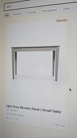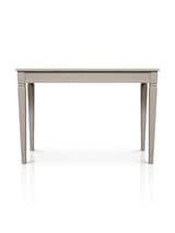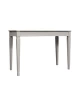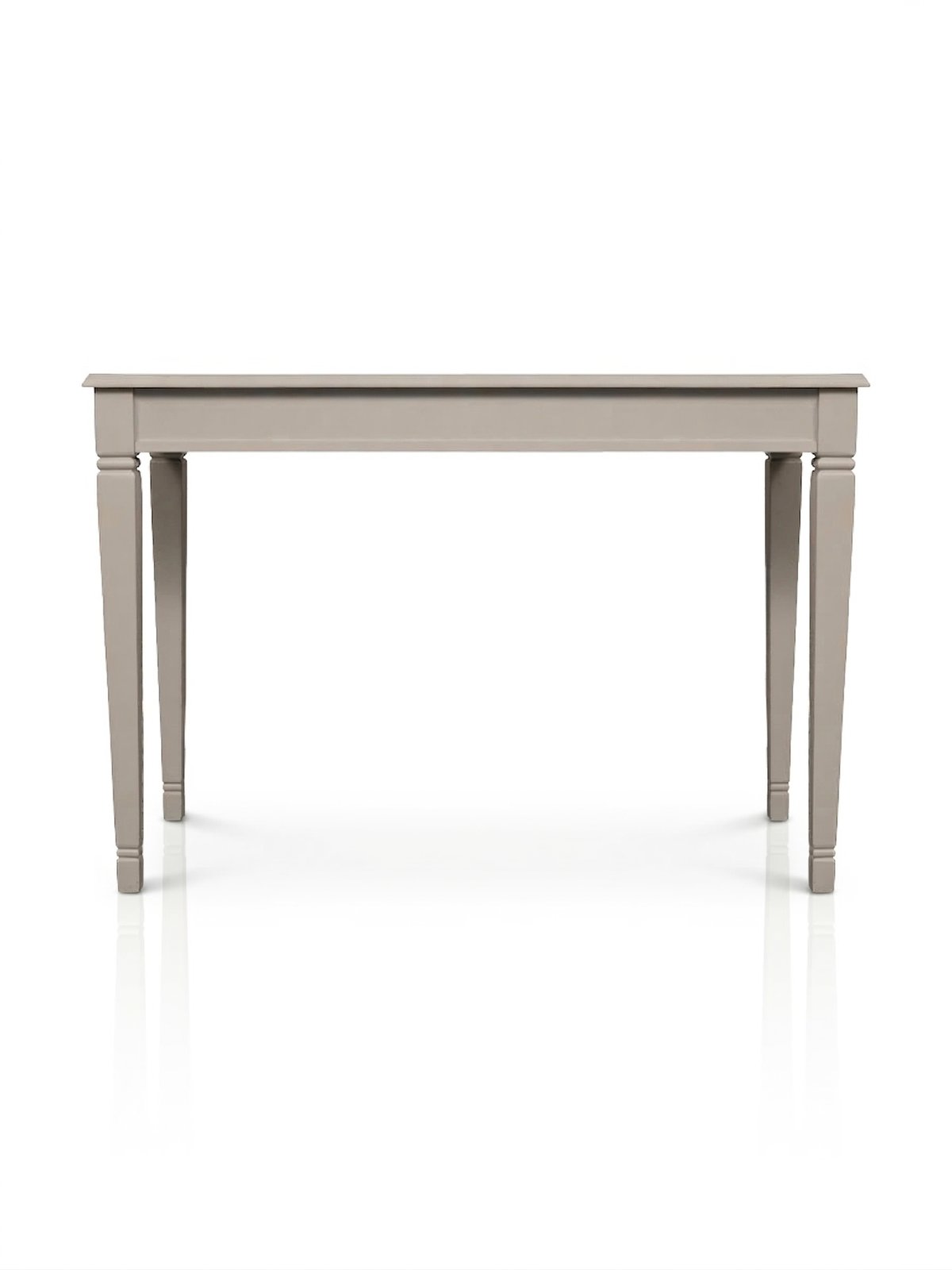 Console table in solid poplar and MDF with a grey painted finish. Rectangular top with a moulded edge, set on four tapered legs. The legs have turned details at the top and block feet.