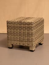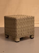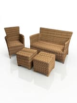 Four-piece garden seating set comprising a two-seater sofa, an armchair, and two matching stools. The frames are woven in a two-tone synthetic rattan over an aluminium base. The sofa and armchair have cylindrical metal legs; the stools have block feet. Cream-coloured seat and back cushions are included.