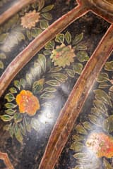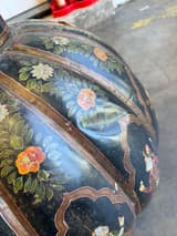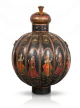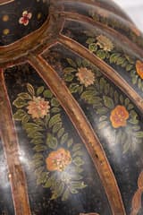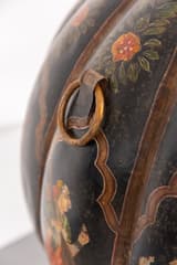 Large floor vase in painted metal with a separate lid. The globular body is divided into vertical panels, each decorated with a hand-painted scene of a courtly figure against a black ground. The panels are separated by raised ribs and framed with gilt borders. The neck and lid are decorated with complementary floral and geometric motifs.