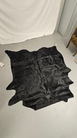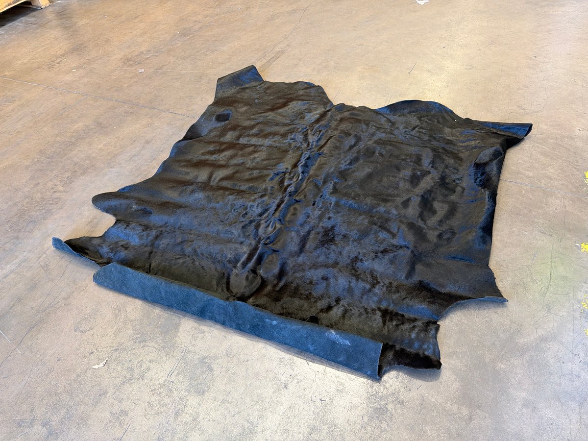 Full cowhide rug dyed a uniform black colour. The short hair has a slight gloss, and the hide retains its natural, uncut shape. The reverse is a soft, unfinished suede.
