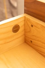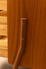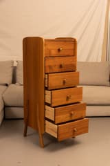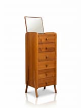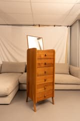 Six-drawer tallboy chest with a hinged mirror set into the top surface. The frame and drawer fronts are teak, with turned teak handles and splayed legs which form part of the solid side panels. The Heal's maker's label is present inside the top drawer.