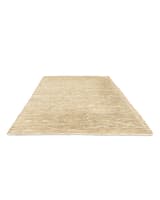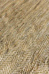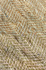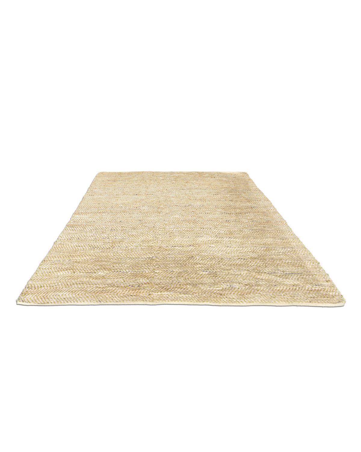 Large area rug hand-woven from natural jute and strips of recycled leather, some with a silvered finish. The materials are combined in a chunky herringbone weave. A hard-wearing piece with a textured surface.