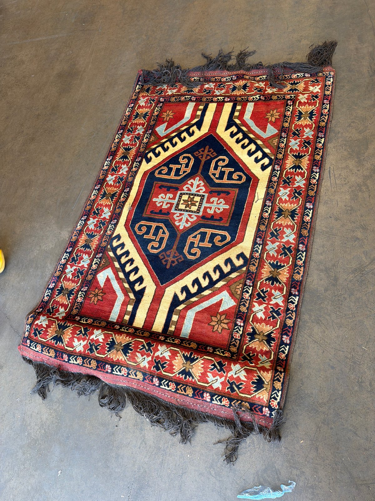 Hand-knotted wool rug with a large geometric medallion in navy blue and red at its centre. The field is cream-coloured, framed by multiple borders with stylised floral and geometric motifs. Finished with a dark grey wool fringe at both ends.