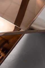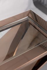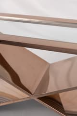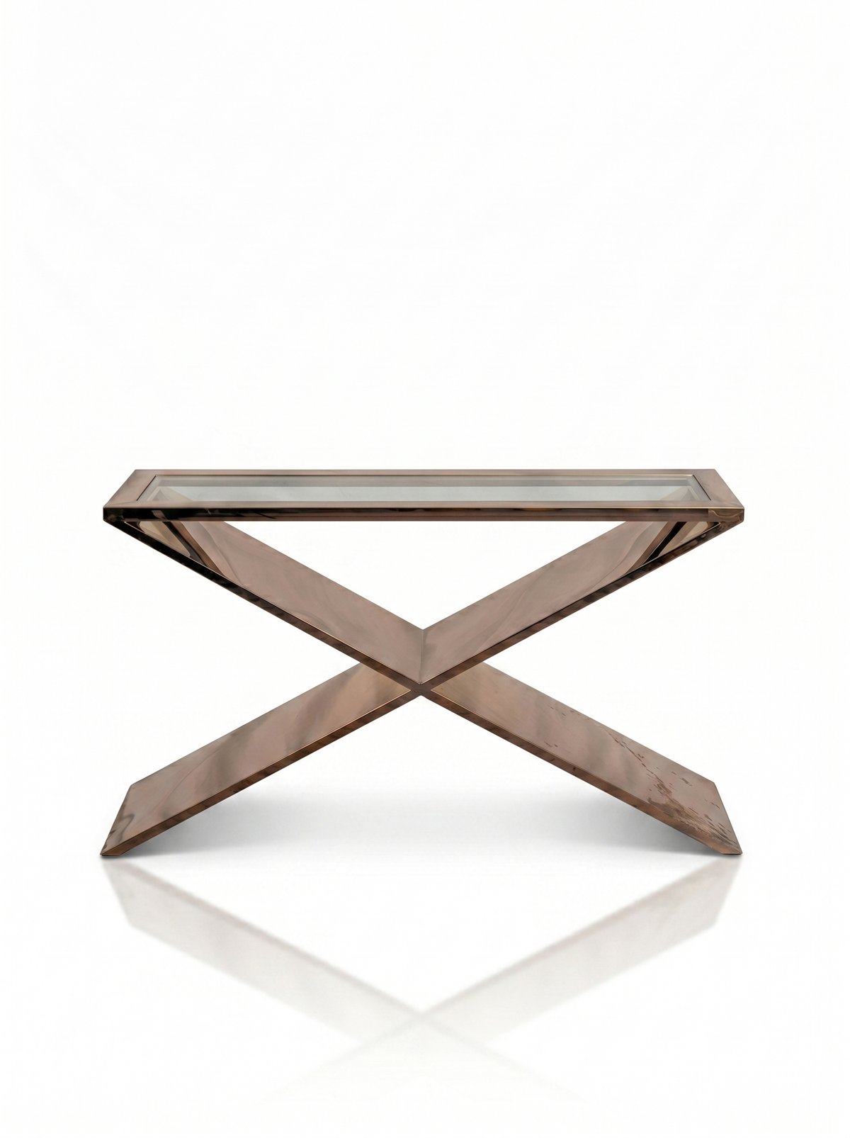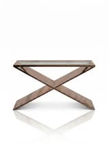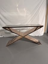 Rectangular console table with a clear glass top, supported by a sculptural X-form base. The frame and base are constructed from metal with a highly polished, reflective bronze-coloured finish. The HD Buttercup maker's label is present.