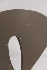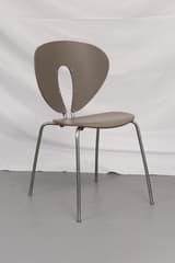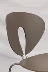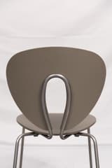 Set of four dining chairs with moulded polypropylene seats and backs in a taupe finish. The frames are tubular steel, and the backs have a distinctive open cutout. Each chair is stamped to the underside with the maker's mark, model name, and designer.