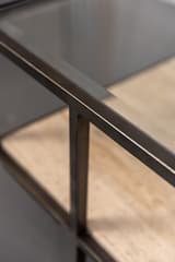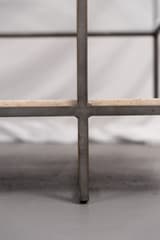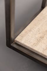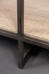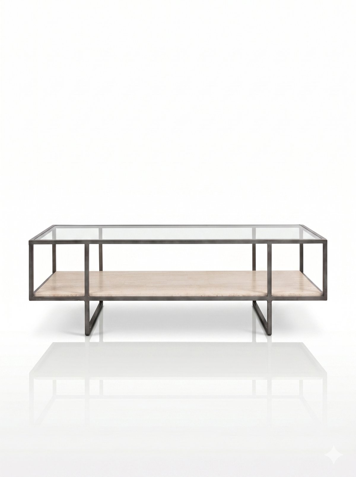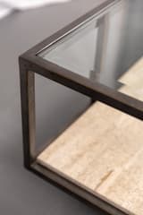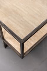 Two-tier coffee table constructed with a dark-finished metal frame. The lower shelf is a single slab of travertine stone. The frame has a simple, open construction with four straight legs.